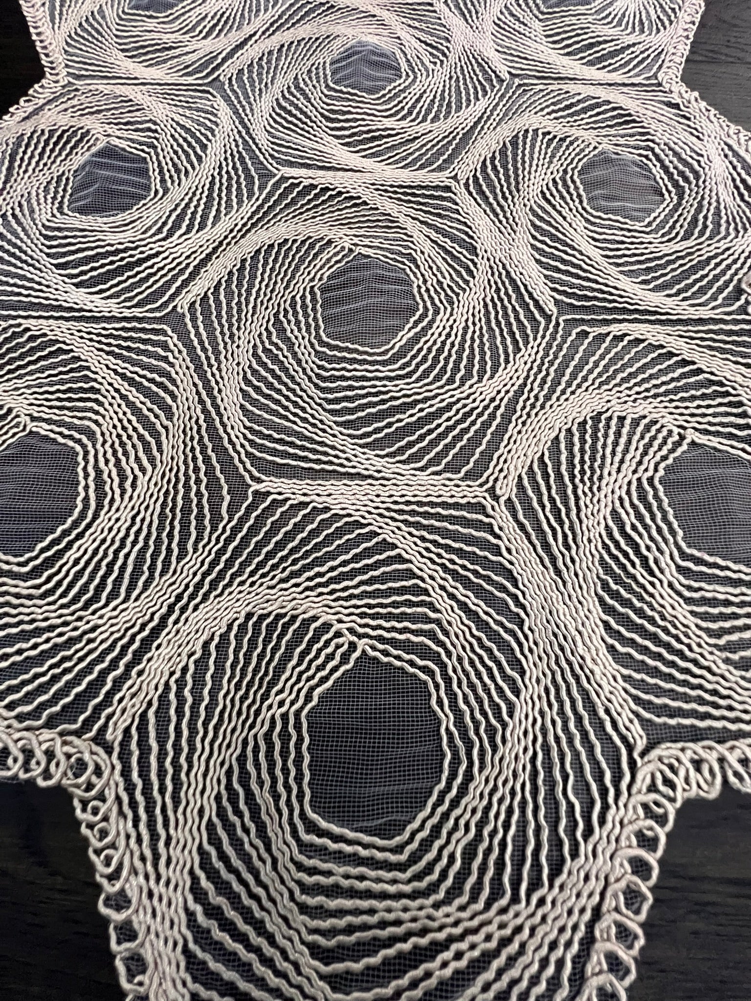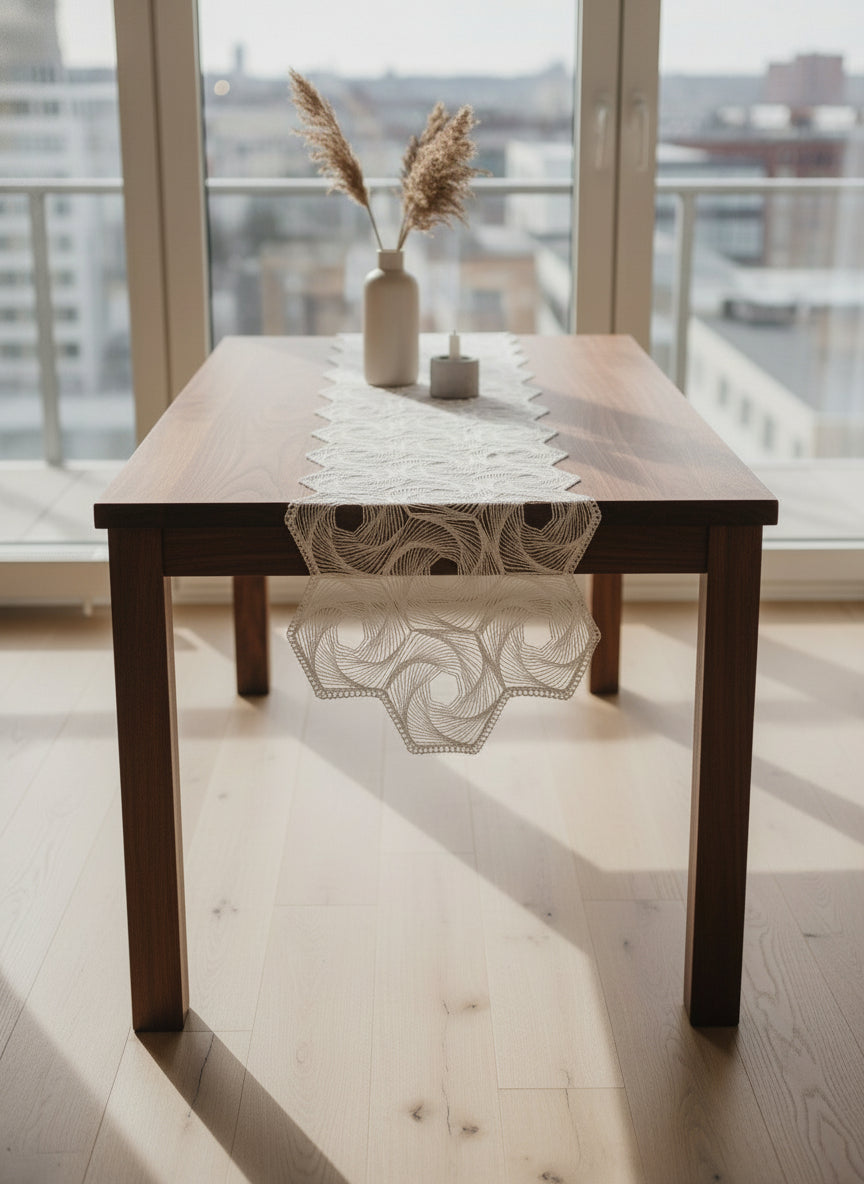 This 110x35cm table runner features elegant French lace details and is made from durable polyester. Its rectangular shape adds a refined touch to any table while being easy to use and long-lasting.