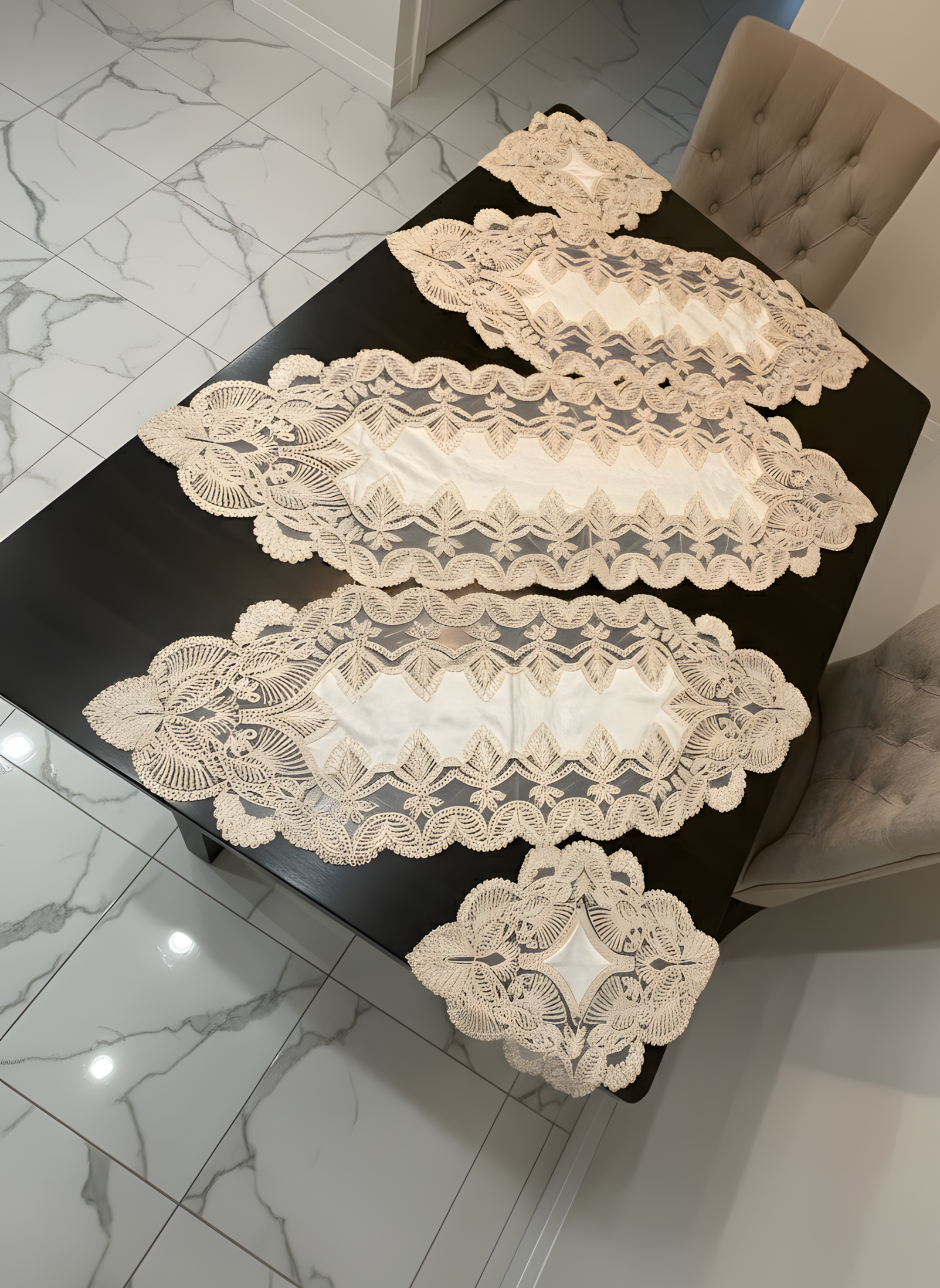 This 5-piece lace table runner set, measuring 130x40cm, 120x30cm, and 45x30cm, showcases a timeless rectangular shape with guipure-trimmed velvet fabric that brings both elegance and a soft touch to your table. Its understated pattern suits various decors and fits standard table sizes effortlessly. Designed for durability and easy care, it offers long-lasting use with straightforward maintenance instructions.