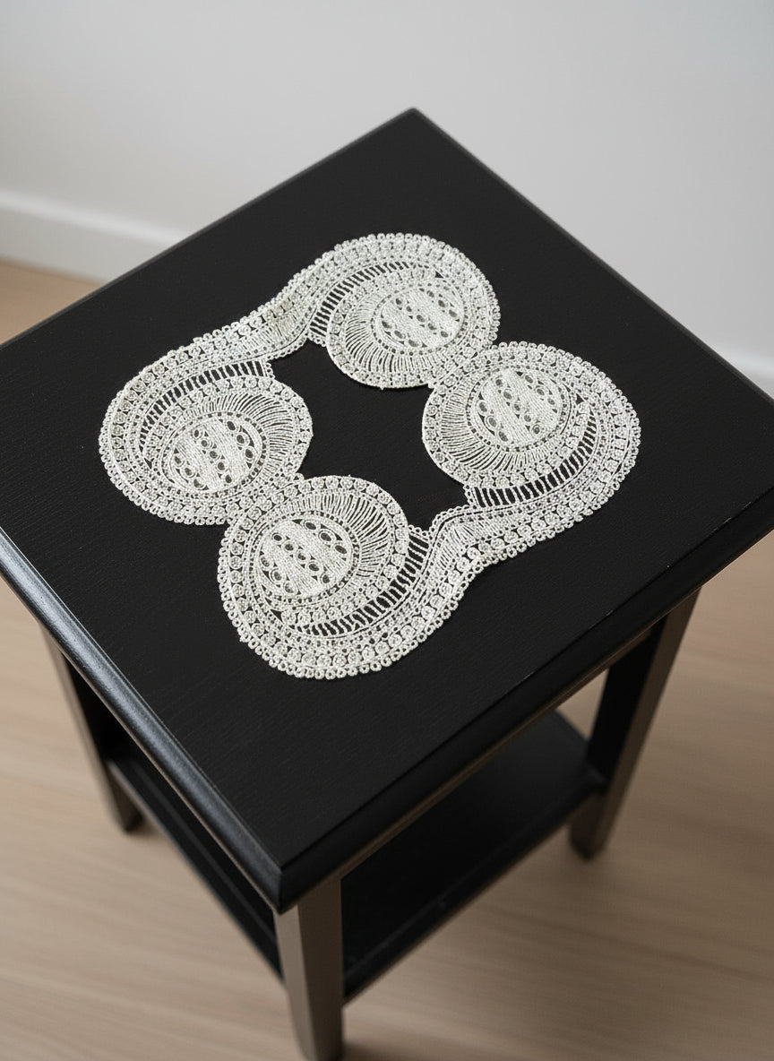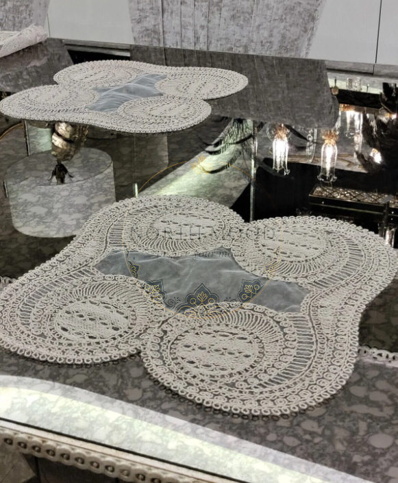 The table Runner N16 measures 40x40 cm and can serve as a placemat, coffee table cover, or console cloth. It features elegant French guipure and cordonnet embroidery on fine tulle, adding subtle sophistication to any space. Compatible with most dinnerware, it enhances your tabletop for gatherings. Easy to care for with a 40-degree wash and no bleach, it combines style and practicality for your home.